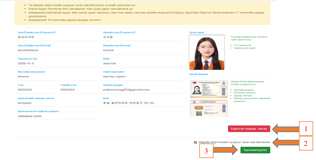 - Бүртгэлийн хуудсыг зөв бөглөсөн эсэхийг шалгаж хэрэв алдаатай байвал бүртгэл хуудас засах товчийг дарж мэдээллээ засах