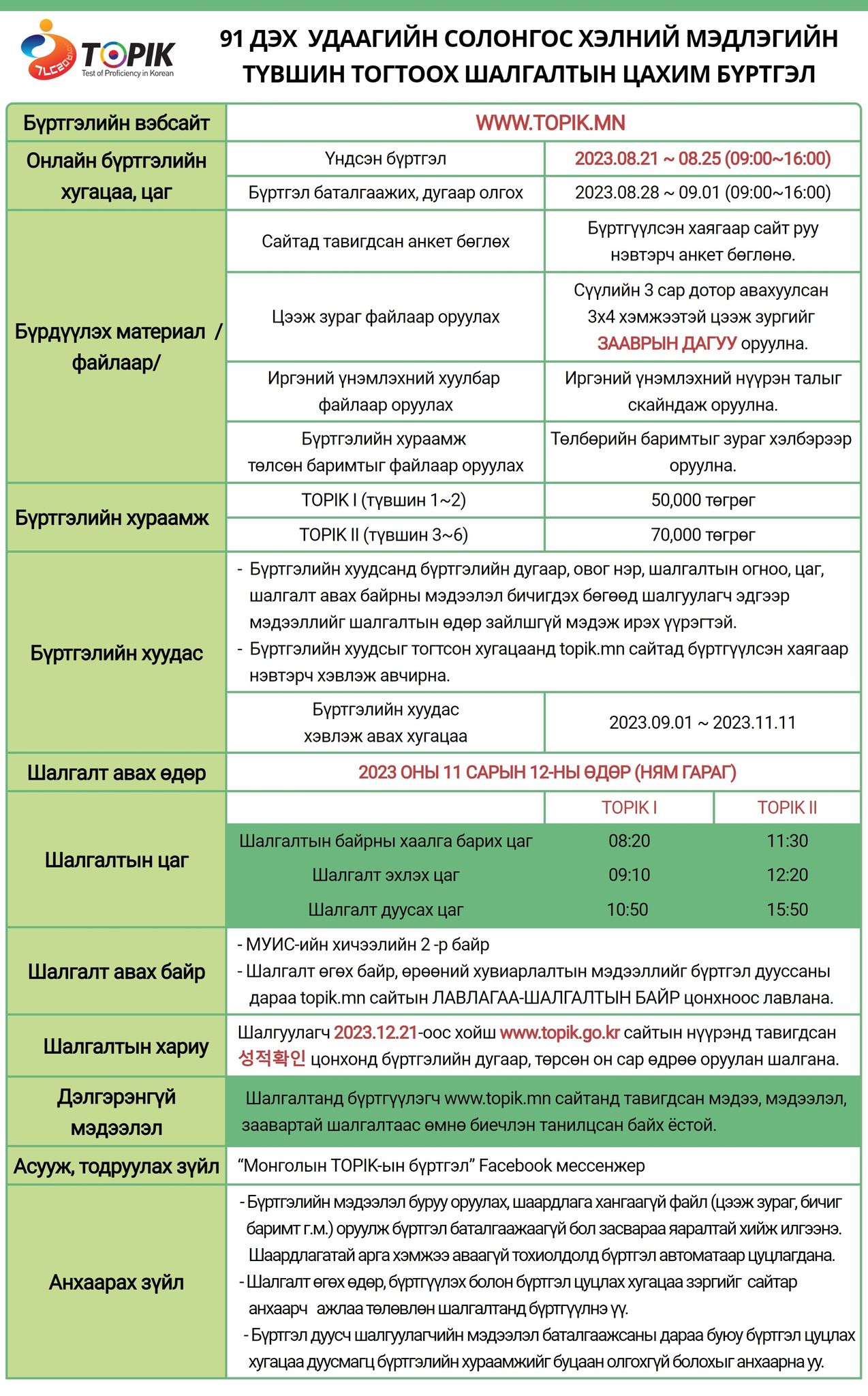 91 дэх удаагийн солонгос хэлний мэдлэгийн түвшин тогтоох шалгалтын бүртгэлийн мэдээлэл