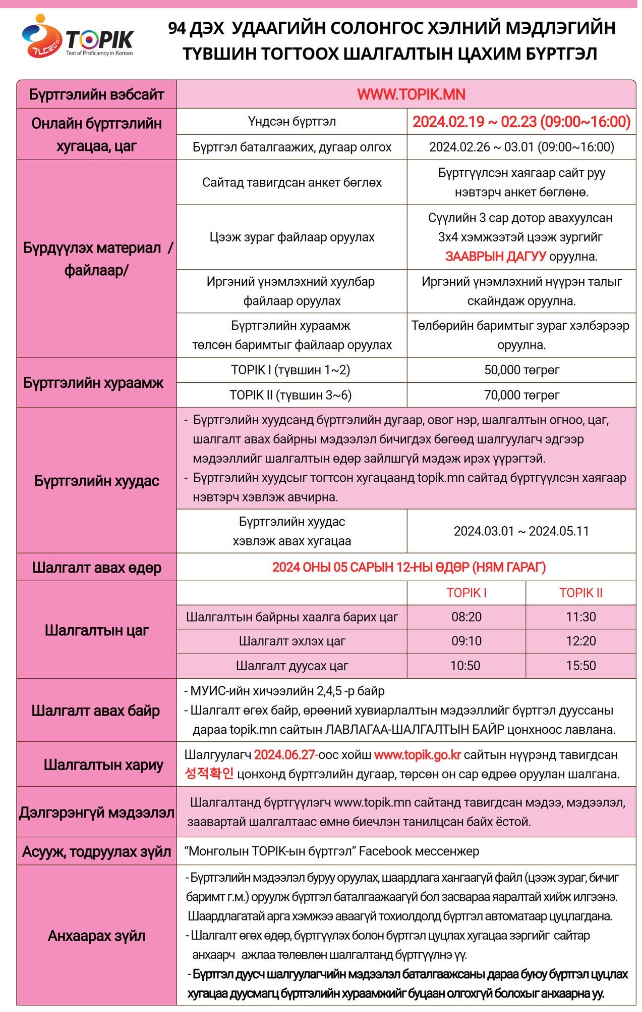 94 дэх удаагийн солонгос хэлний мэдлэгийн түвшин тогтоох шалгалтын бүртгэлийн мэдээлэл